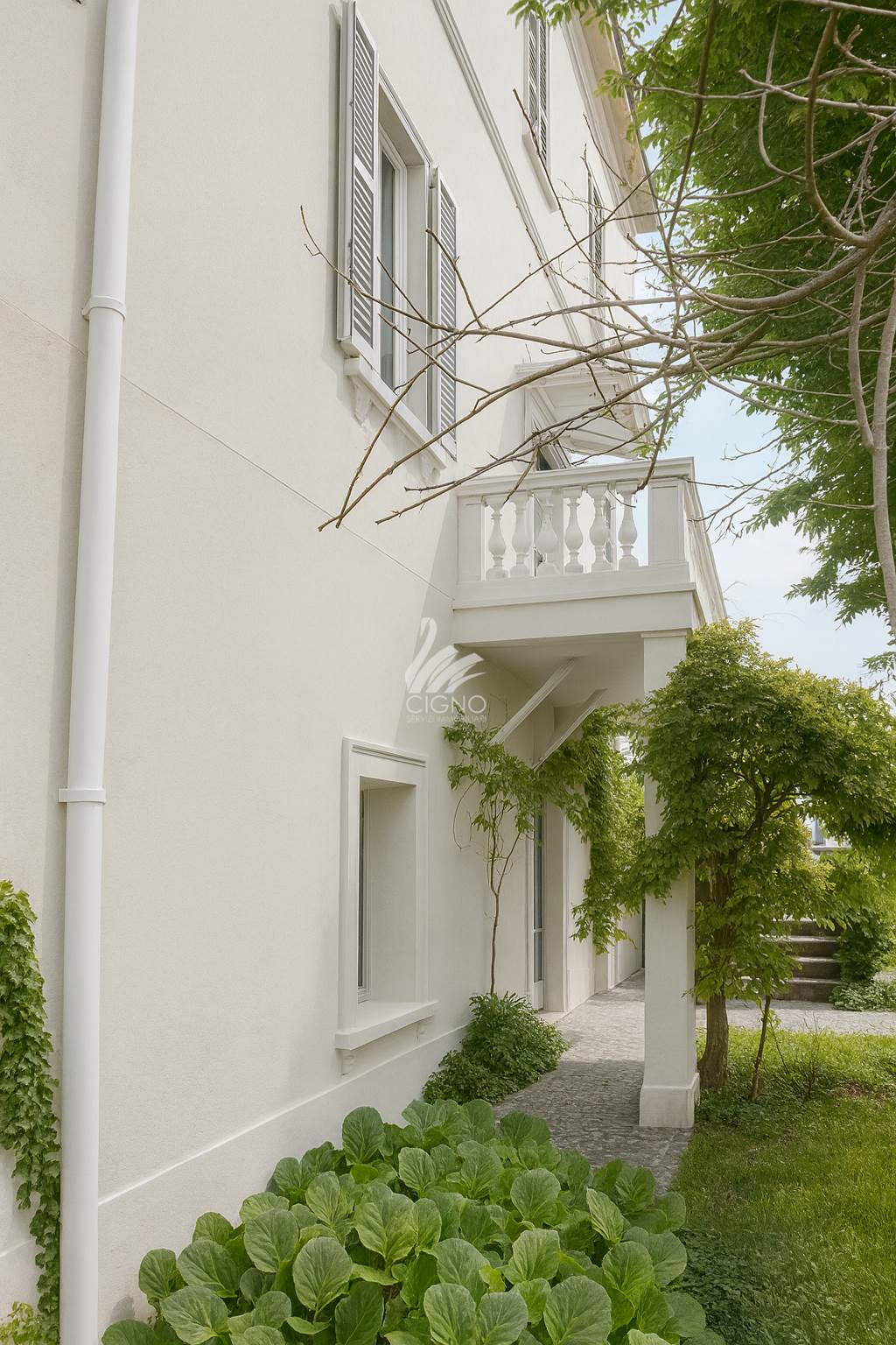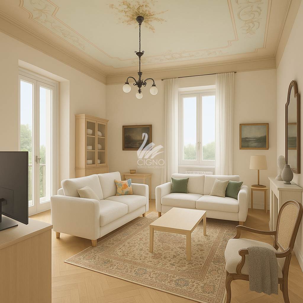 La villa si sviluppa su 342 mq distribuiti su due livelli, avvolti da un’atmosfera d’altri tempi e impreziositi da soffitti affrescati che raccontano il fascino di un passato prestigioso. Gli ambienti, ampi e luminosi, sono costantemente inondati di luce naturale e regalano una vista aperta e suggestiva sul Monte Rosa, capace di emozionare in ogni momento della giornata.